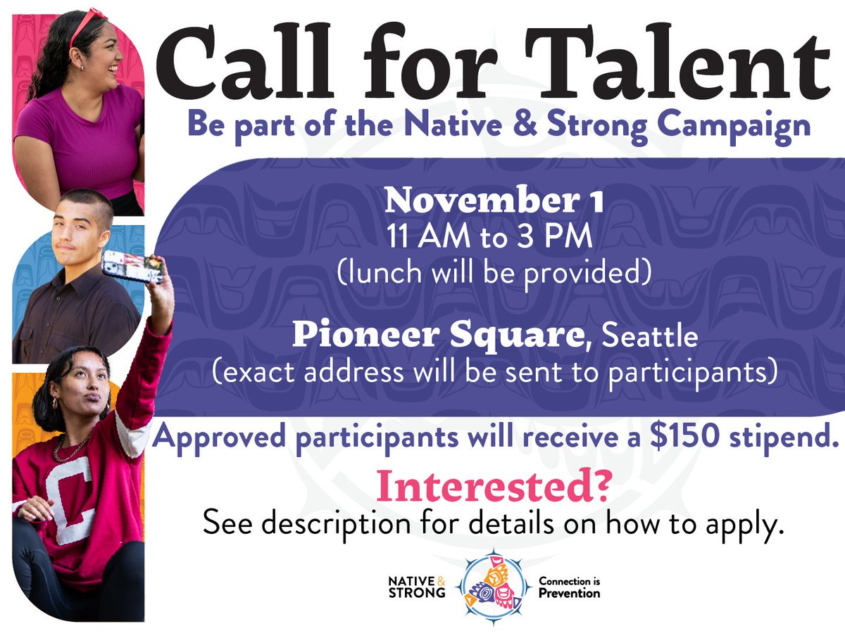 We’re casting Native youth (ages 14-18), veterans, and 2SLGBTQIA+ relatives for our next Native & Strong campaign photo and video shoot in Seattle.